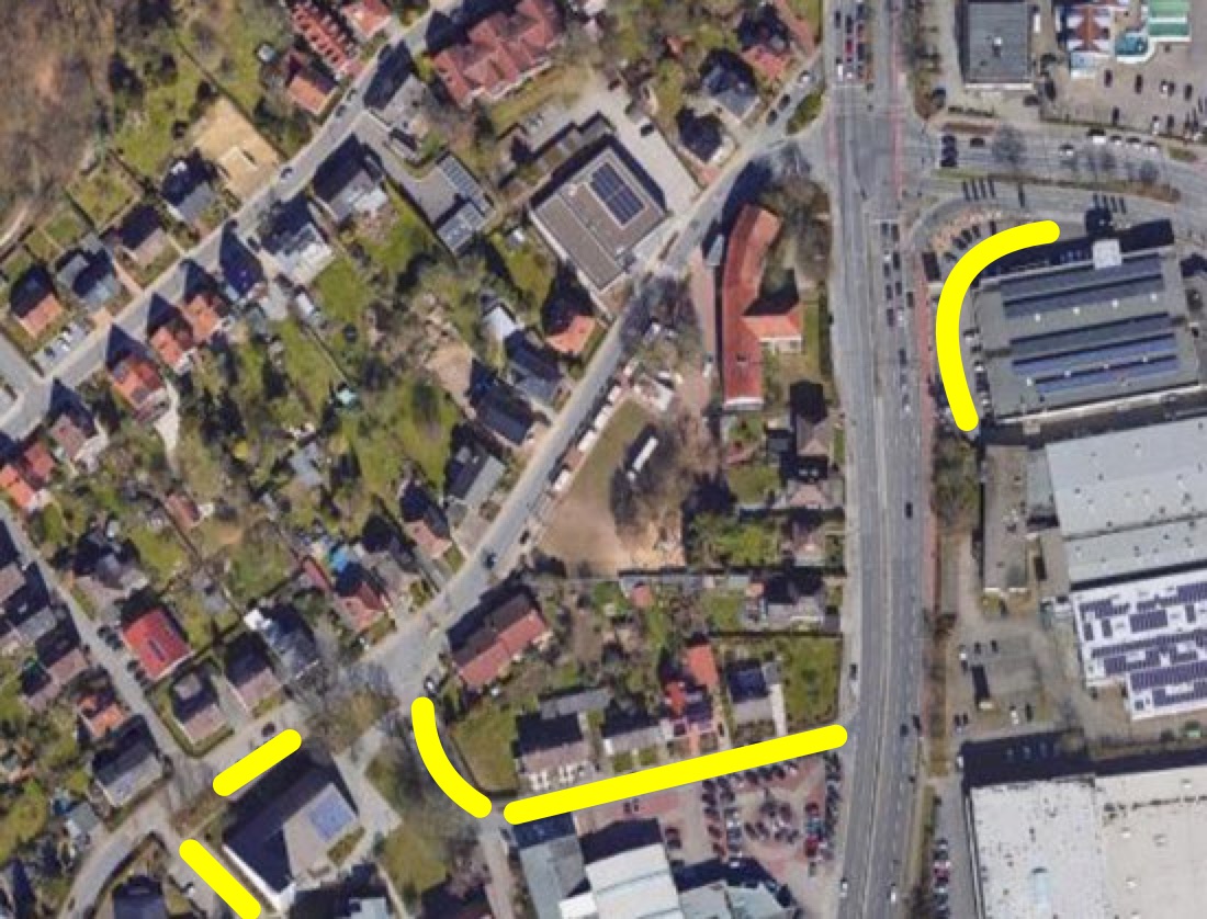 Sollten Sie dennoch dringend eine Ausstiegsmöglichkeit benötigen, orientieren Sie sich bitte an dem Luftbild. Dort können Sie kurzzeitig halten und die Kinder zur Schule schicken.