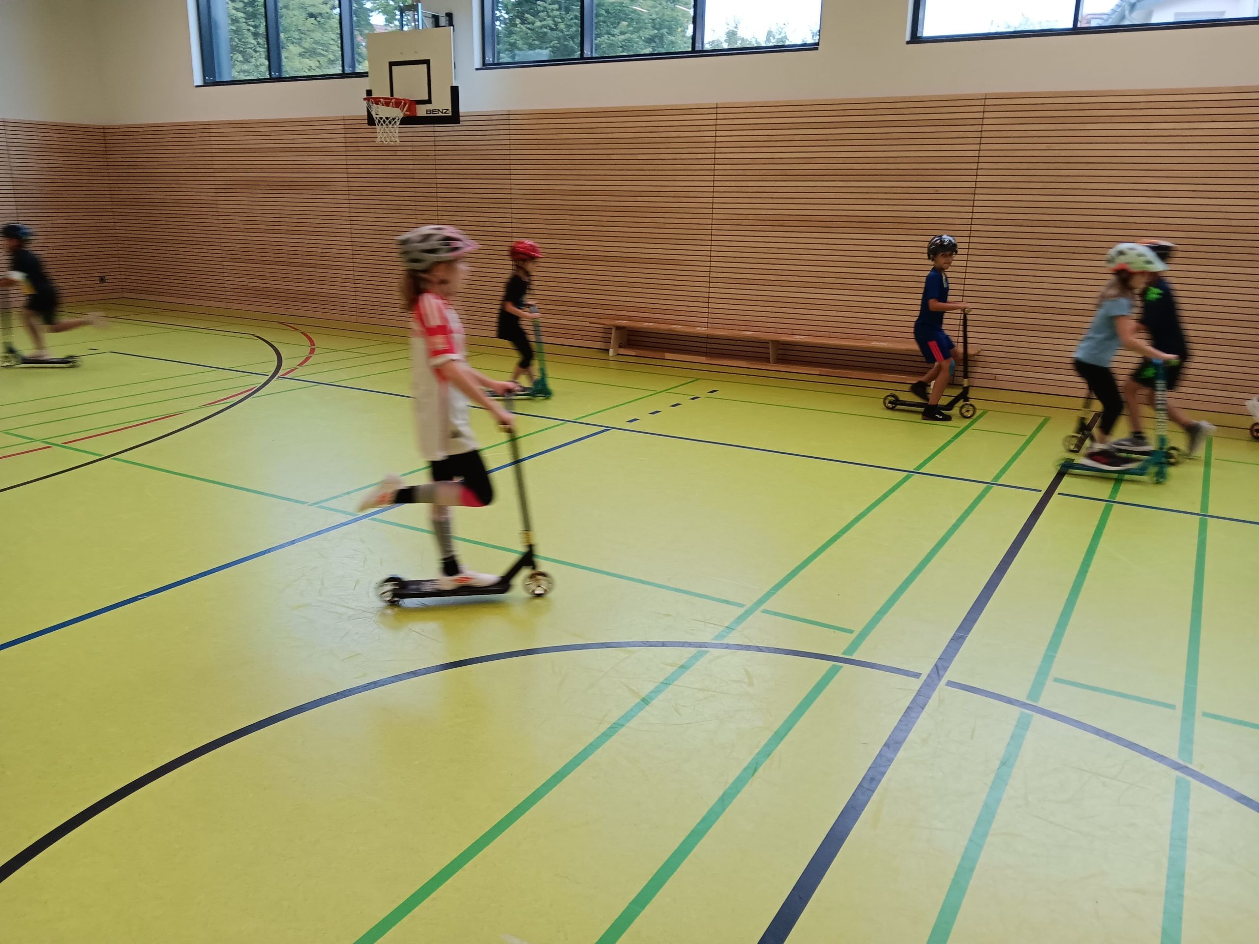 Vom 16.09.2024 bis zum 27.09.2024 war das RollerFit-Mobil bei uns. Die Kinder wurden in spannenden und abwechslungsreichen Trainingseinheiten im sachgerechten Umgang mit dem Roller geschult. In unserer Turnhalle absolvierten sie verschiedene Parcours, fuhren sicher um Hindernisse, übten das Rollerfahren zu zweit und lernten das richtige Bremsen. Selbst Kunststücke auf dem Roller konnten erprobt werden.